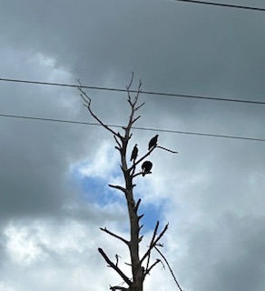As I drove down the asphalt road, the heat waves were visible in eery throbbing images. A dead pine was on my left side. Black vultures perched on the rotten limbs.